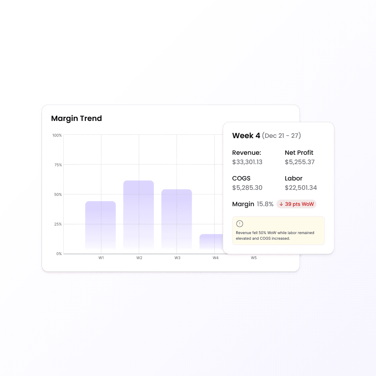 Turn unit performance into a weekly control system. See exactly where your margin moved yesterday so you can act today.