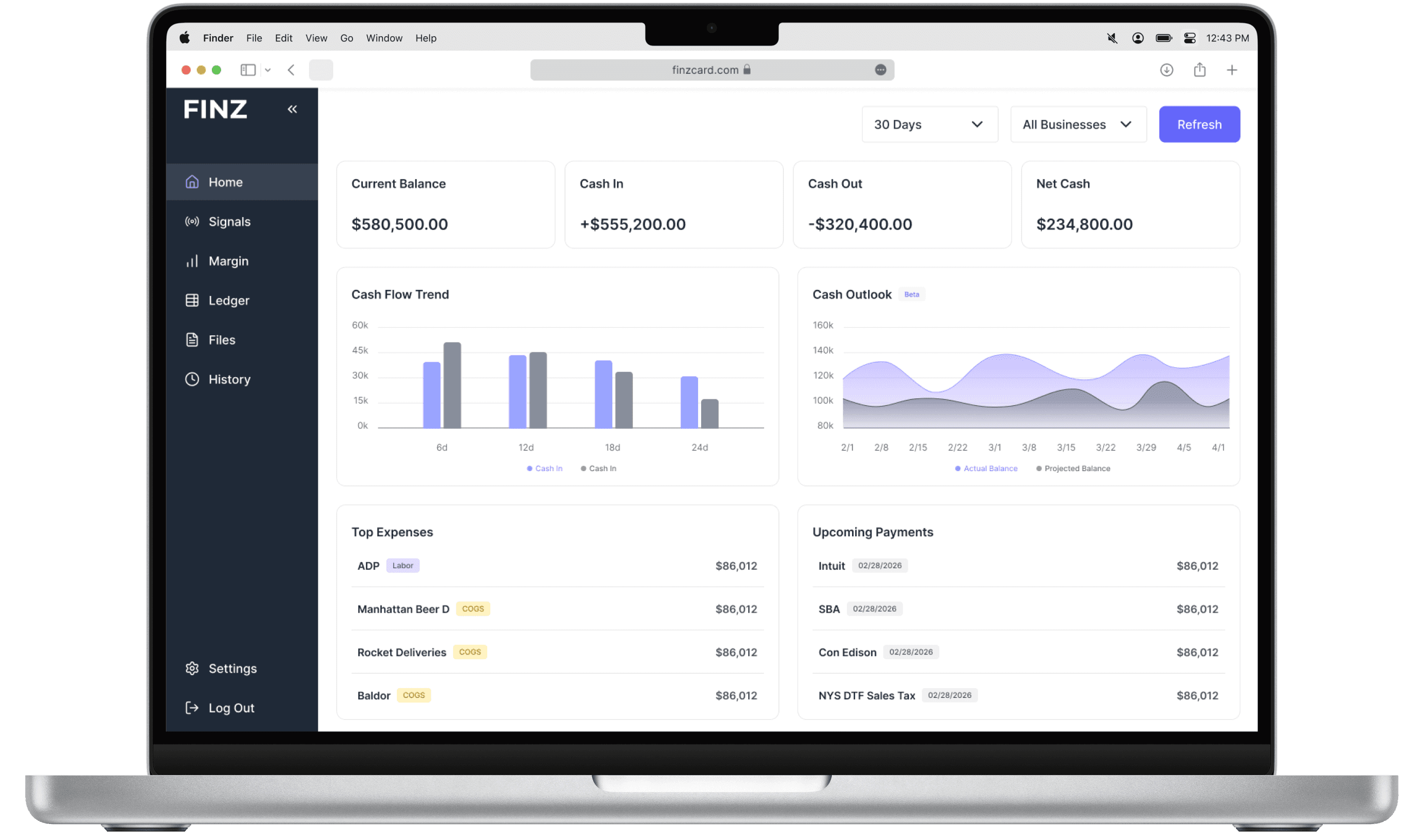 All inflows, outflows, payroll, and upcoming obligations at one place.